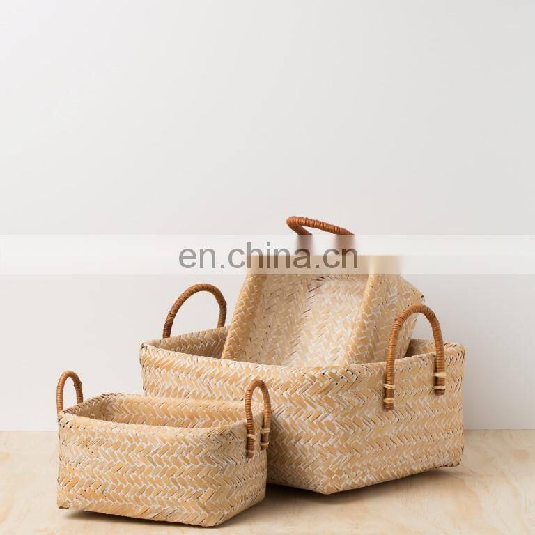White washed Bamboo Storage Basket with handle Set Of 3 Wholesale Handwoven Made in Vietnam