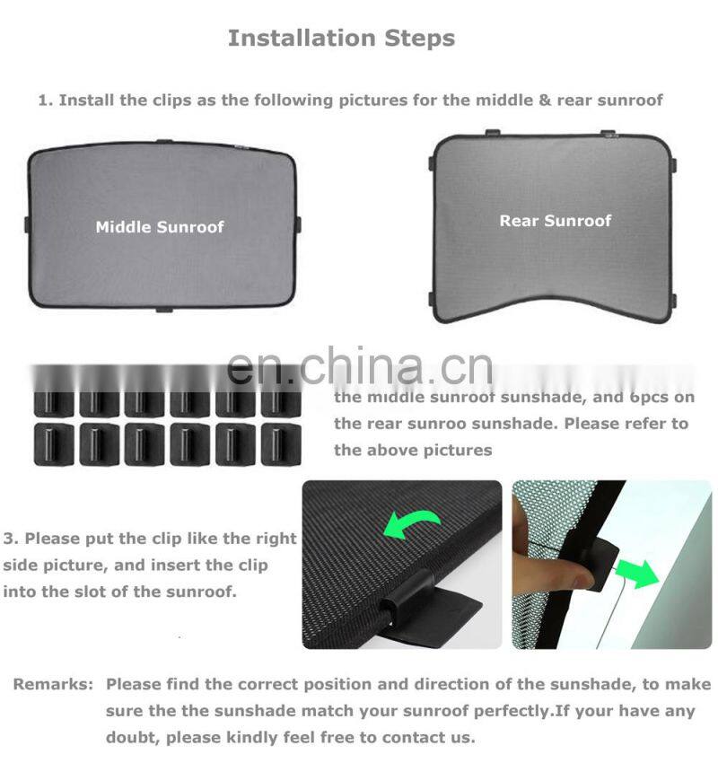 ♥ Original design clips fit for model 3 glass roof mesh sunshade. It is easy to install, justuse the clips to fix the sunshde on