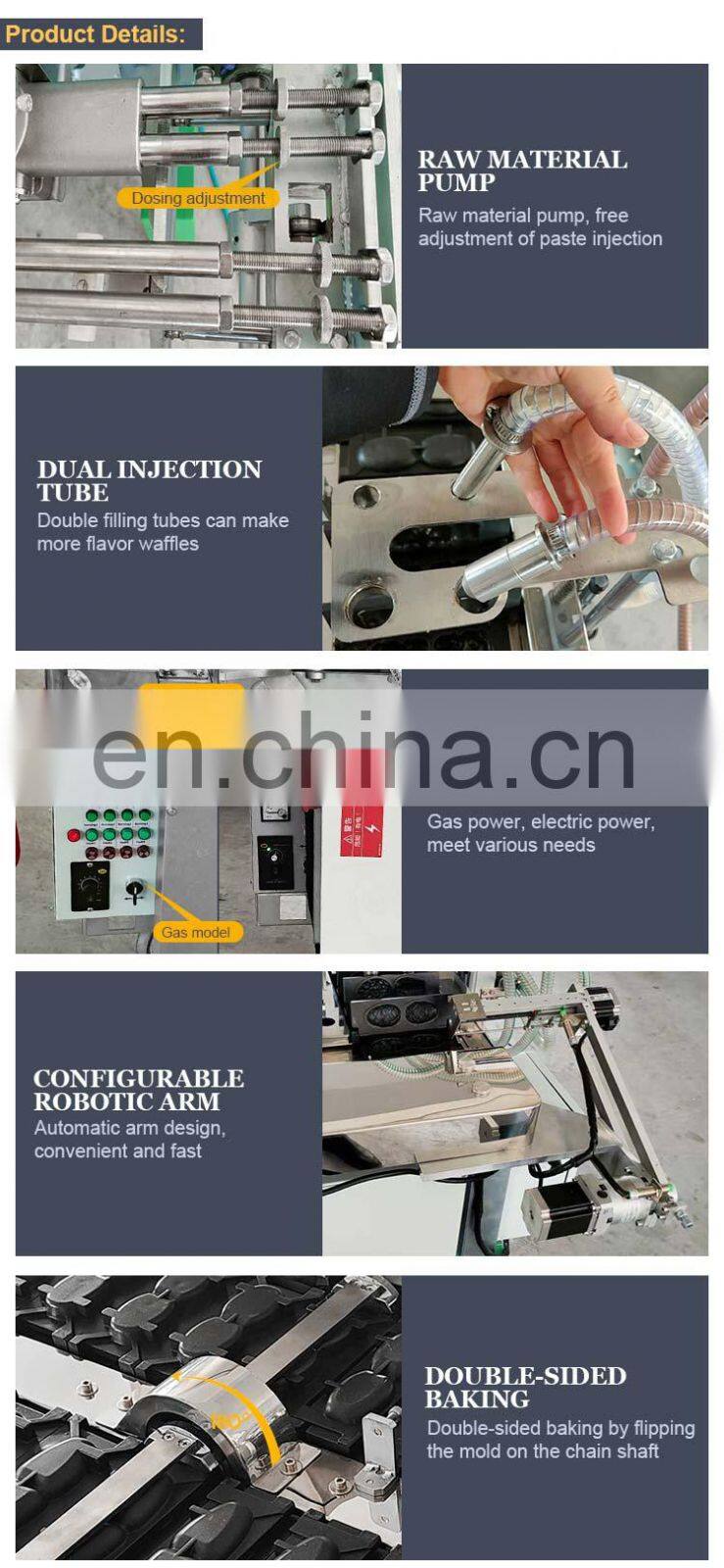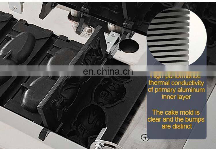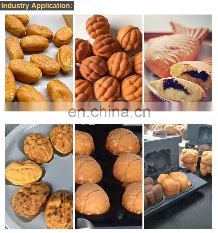 This Taiyaki cake machine is fully automatic model. It can finish material filling, forming and roasting whole process. It can produce different shape product through changing different