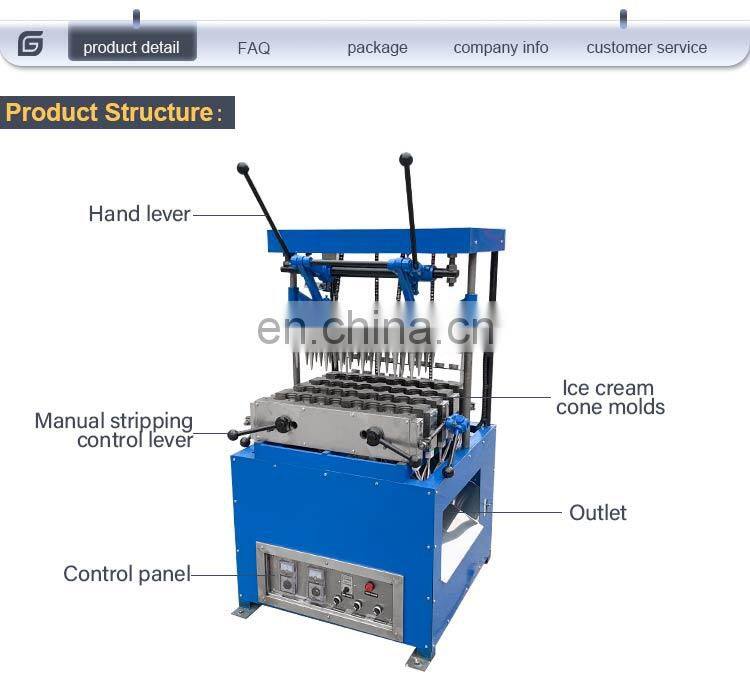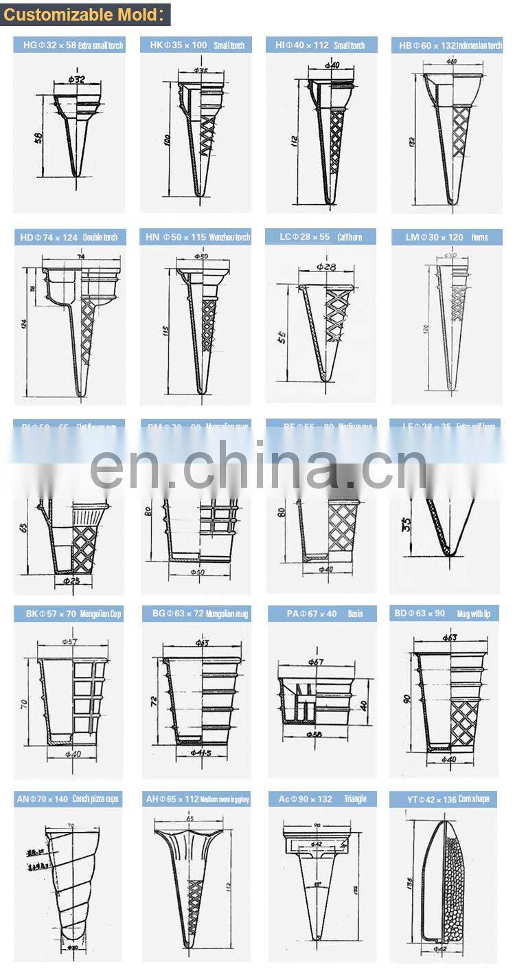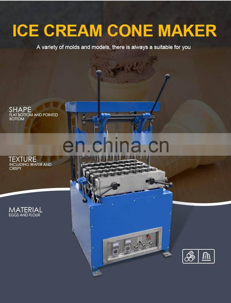 The ice cream cone making machine is made from flour as material, it is perfect container for ice cream or other similar food and equipment. The same kind of mould can exchange and one machine can match many kind of mould to exchange.