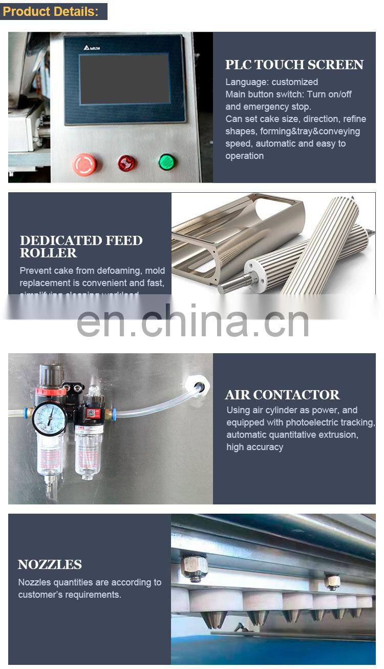This cake depositor machine is ideally suited for quick and efficient application of sponge cake,cup cake,chiffon cake,Swiss roll,Macaron.