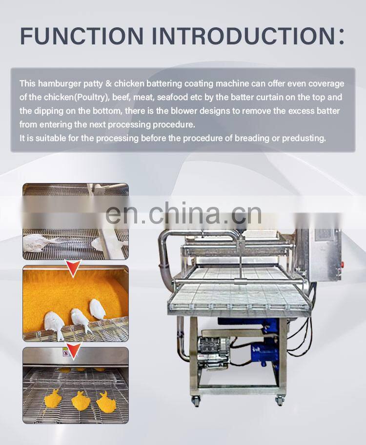 This hamburger patty & chicken battering coating machine can offer even coverage of the chicken (Poultry), beef, meat, seafood etc by the batter curtain on the top and the dipping on the bottom, there is the blower designs to remove the excess batter from entering the next processing procedure. It is suitable for the processing before the procedure of breading or predusting.
