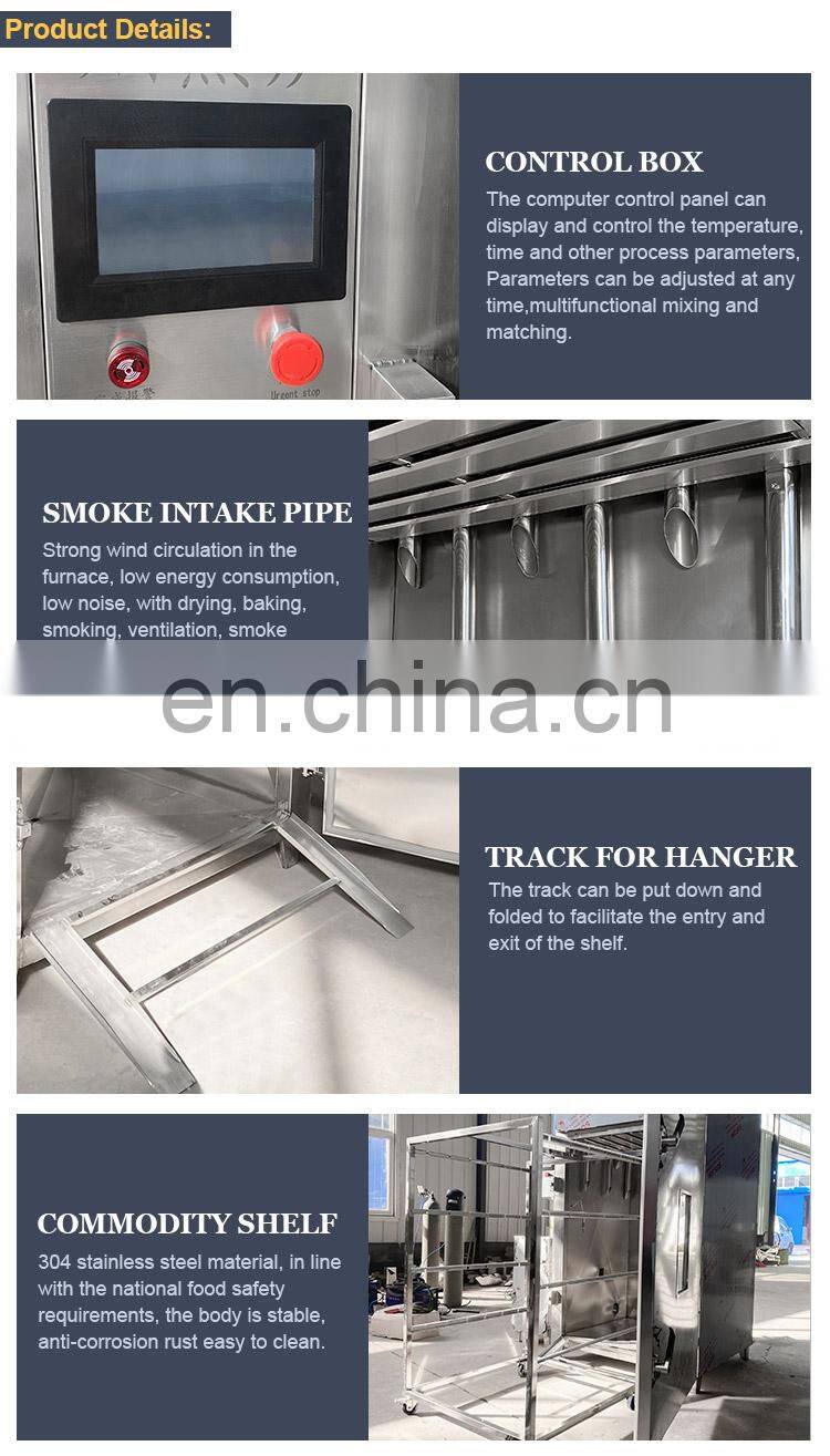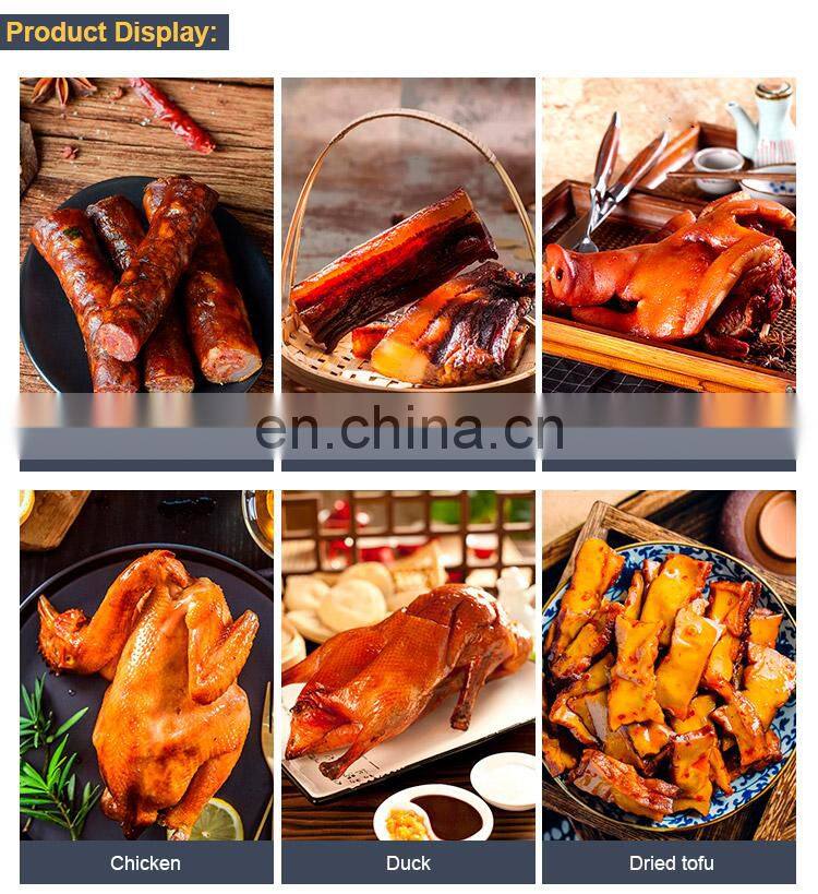 1.Instead of traditional earthen furnace, it is a fully automatic operation equipment integrating cooking, drying, smoking and coloring. Save labor and improve efficiency.