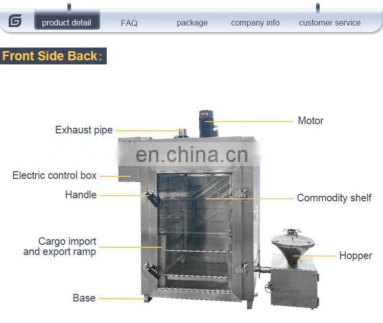 Smoked oven machine for meat, sausage ,ham, roasted sausage, chicken, fish, roast duck and poultry, aquatic products and other smoked products, cooking, drying, coloring a molding. Smoked good color and luster, taste better. Quality assurance, excellent technology, convenient operation,after the color of food after smoke look good, still have a kind of fragrance after smoked, feel fragrant and not be bored with, also can achieve environmental protection effect, completely take the place of a traditional smoked furnace method.