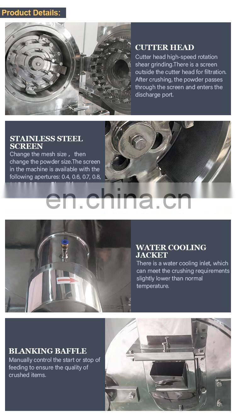 1. The universal powder grinder may be widely applied in industries, such as medicine, chemical and food,etc., for grinding of dry and fragile materials. Materials with low softening point and big viscosity are not appropriate for this machine.