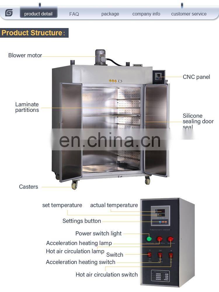 Hot air circulating drying oven applies a low-noise and high temperature-proof axial flow blower and an automatic temperature control system which is fully sealed, making that the heat efficiency of the drying oven increases from 3-7% of traditional oven to 35-45% of the present one, the highest heat efficiency can reach 50%. GD series special drying oven adopts the axial flow fan, with automatic constant temperature control system. Its thermal efficiency is more than 95%, which uses electricity as heating source and adopts convective heat transfer method to heat the air by axial flow fan and heat exchanger . Fresh air from the air inlet supplement, waste damp is out from the dehumidification system. Constantly add fresh air and discharge damp to keep the correct relative humidity in the oven. The biggest characteristic of this series of drying oven is that most hot air is cycling in the cabinet, the entire cycle is closed, so as to enhance the heat transfer, saving the energy.