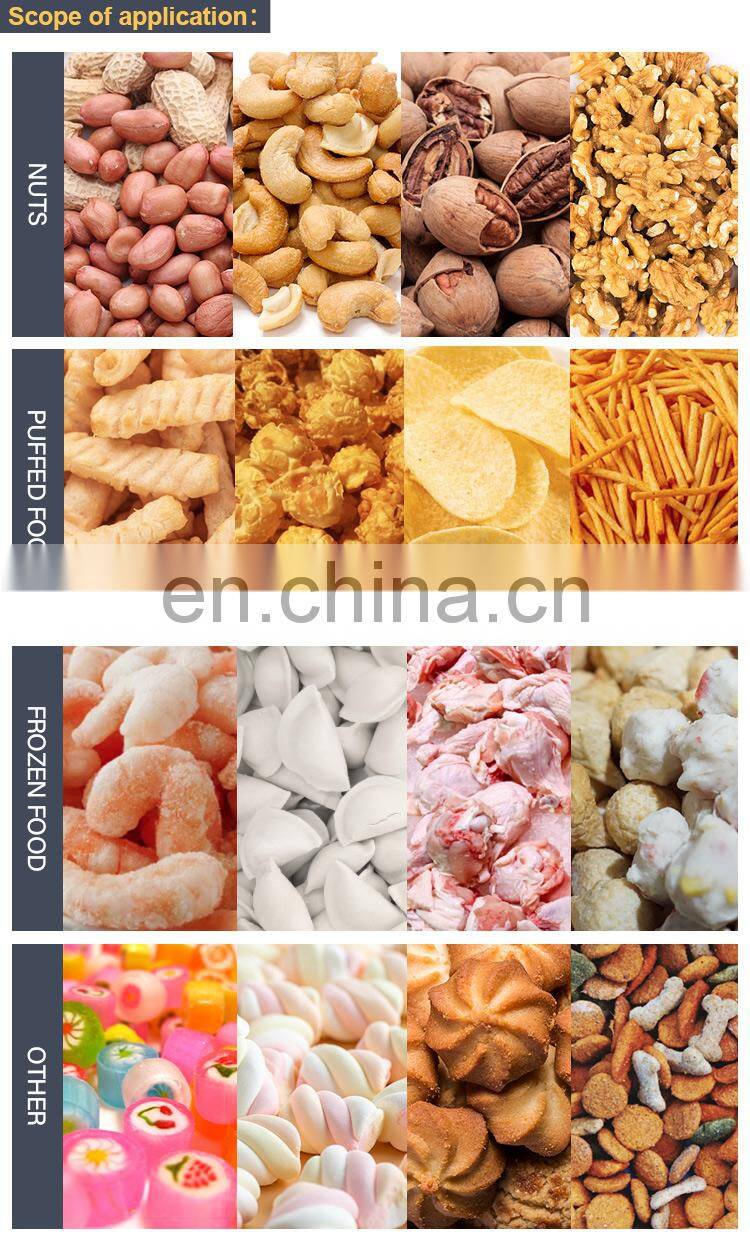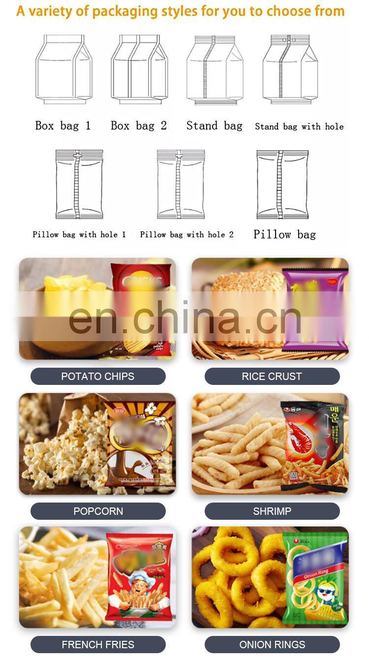 Suitable for packaging many different kinds of products; such as puffy food, shrimp roll, peanut, popcorn, cornmeal, dried fruit, seed, small hardware,dumplings, vegetable, fruits and sugar etc.which shape is roll, slice and granule.