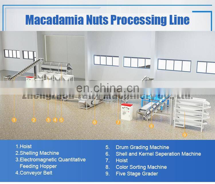 1.This macadamia nut production line consists of nut grader, sheller, shell and kernel separator, color sorter, and kernel grader.