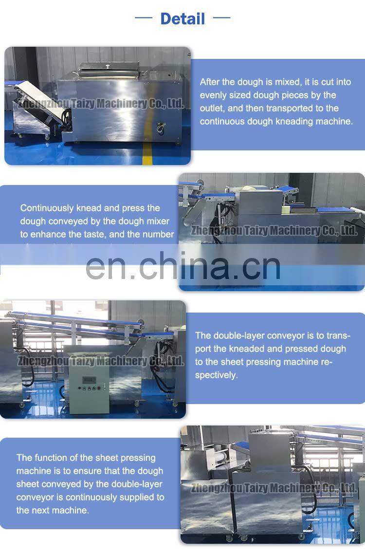 Pita Bread Production Line includes Dough mixer with conveyor, Automatic dough sheeter, Double layer conveyor, Dough press machine.