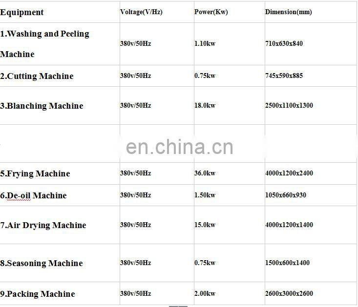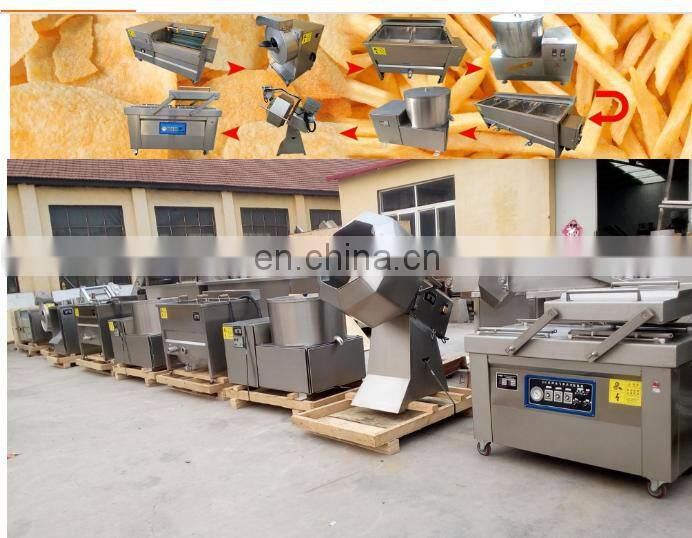The french fries production line is mainly used to make potato chips and othe fried snack food.The french fries production line is made up of cleaning and peeling machine,cutting machine,blanching machine,dewatering machine,frying machine,deoiling machine,seasoning machine and packing machine.You also can add elevators to potato chips making line to make your work easier .