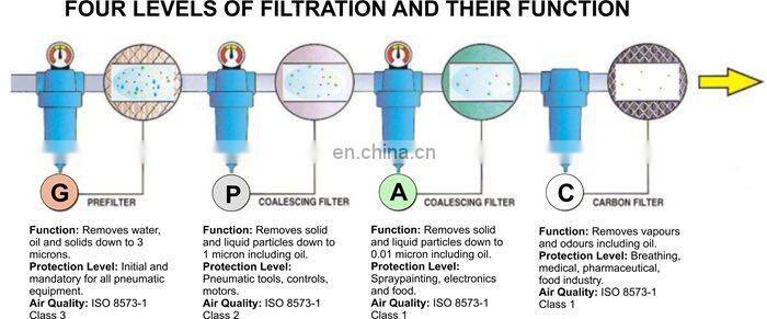 complete removal of oil in compressed air, liquid water, impurities, the equivalent replacement of various imported brands of filter, Hankison, Domnick-Hunter ,America British Italy Hiross, Germany Ultrafilter, Germany Zander, Allas CopcoAtlas original brand filter, in order to meet the needs of different users.