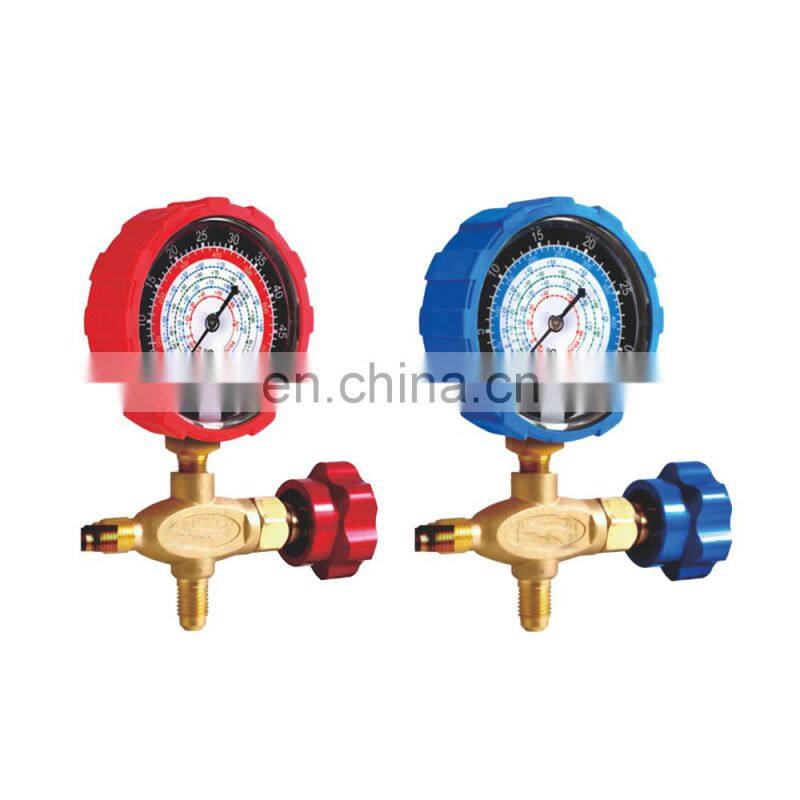 Single Manifold Gauge Set HVAC refrigeration system auto air conditioner brass AC Charging Connection:1/4SAE Brass body Aluminum handle rubber ring shock absorber Selectable Refrigerants: R134A R22 R12 R502 R410A R404 R1234YF
