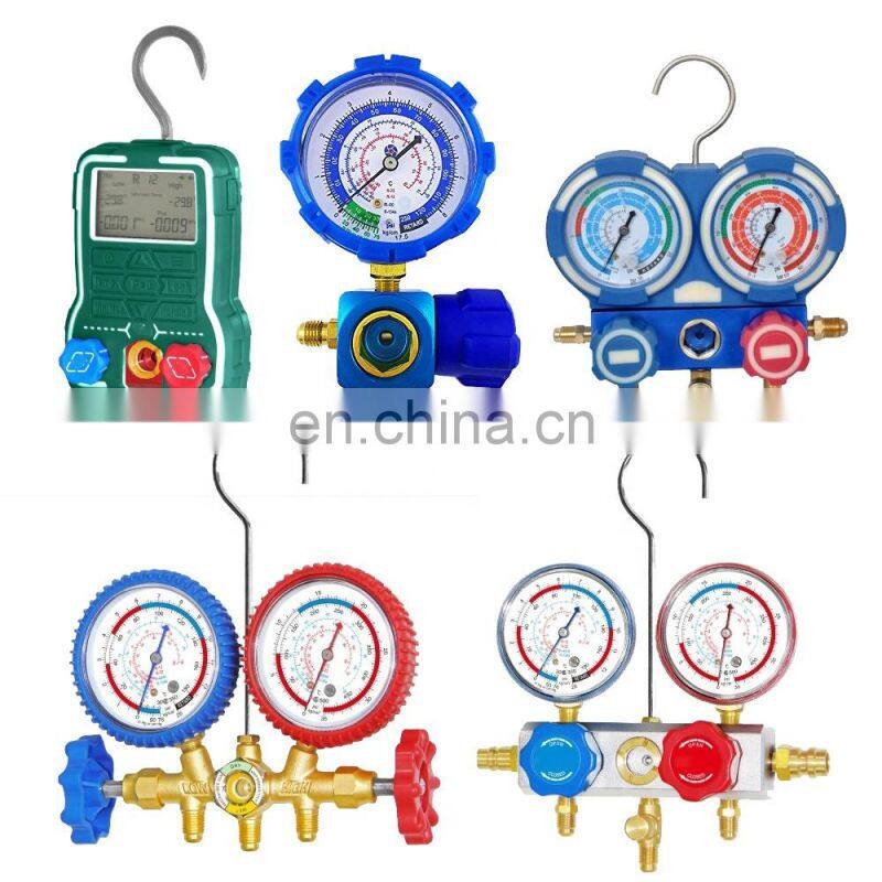 Manifold Gauge Set HVAC refrigeration system auto air conditioner brass AC Charging Connection:1/4SAE brass & aluminum body The plastic & aluminum handle rubber ring shock absorber Selectable Refrigerants: R134A R22 R12 R502 R410A R404 R1234YF