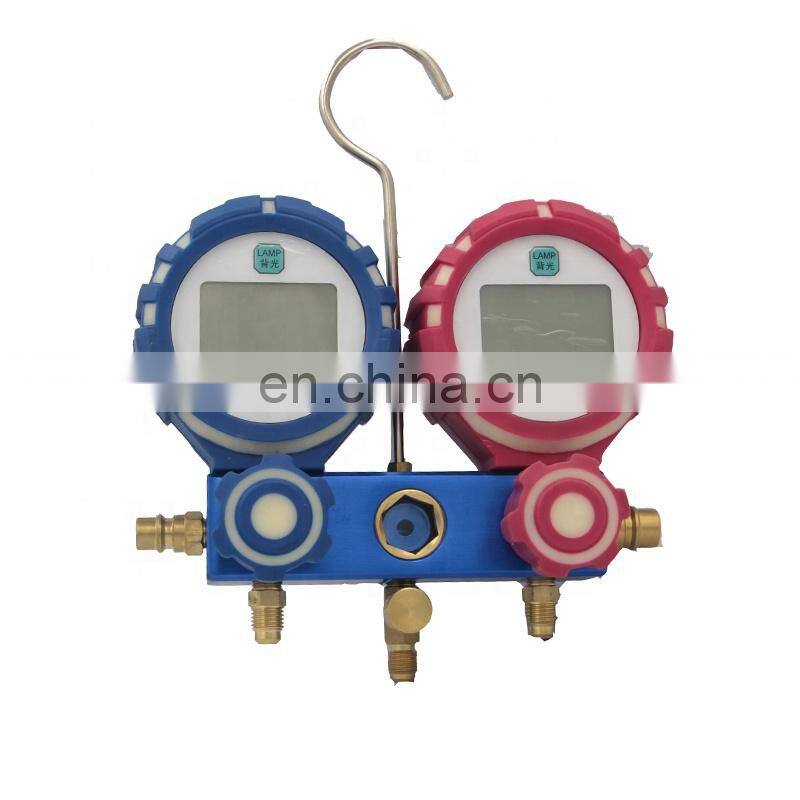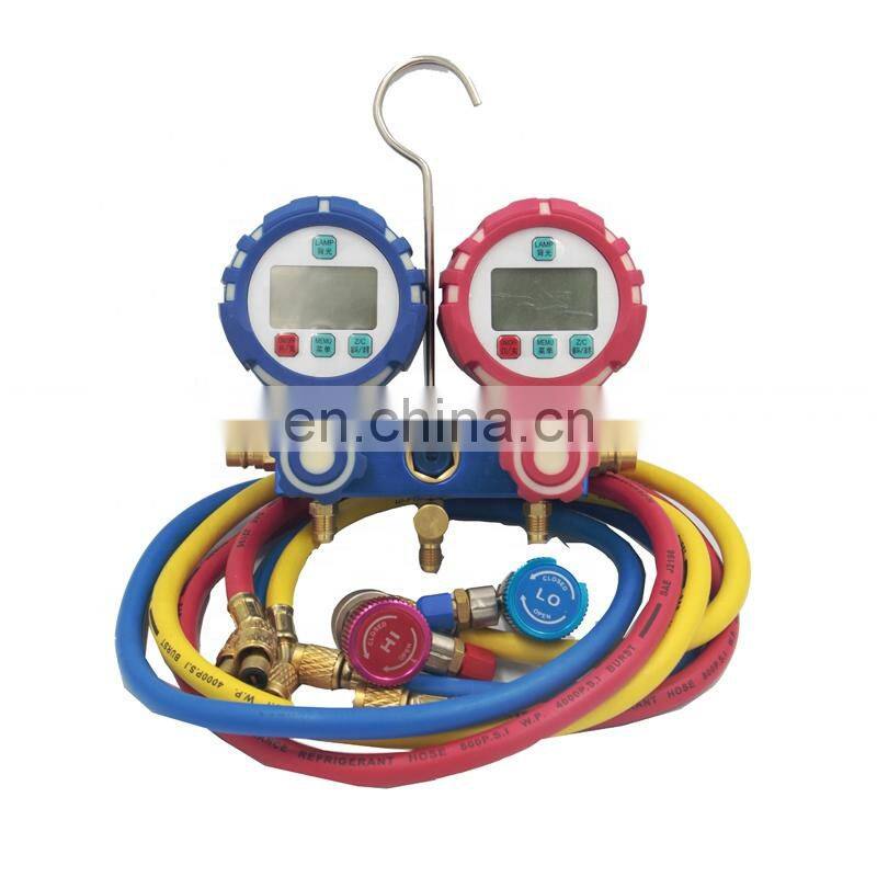 This new digital display aluminium body R32 and1234yf refrigerant gauge set, best digital 4 way refrigeration manifold gauge is