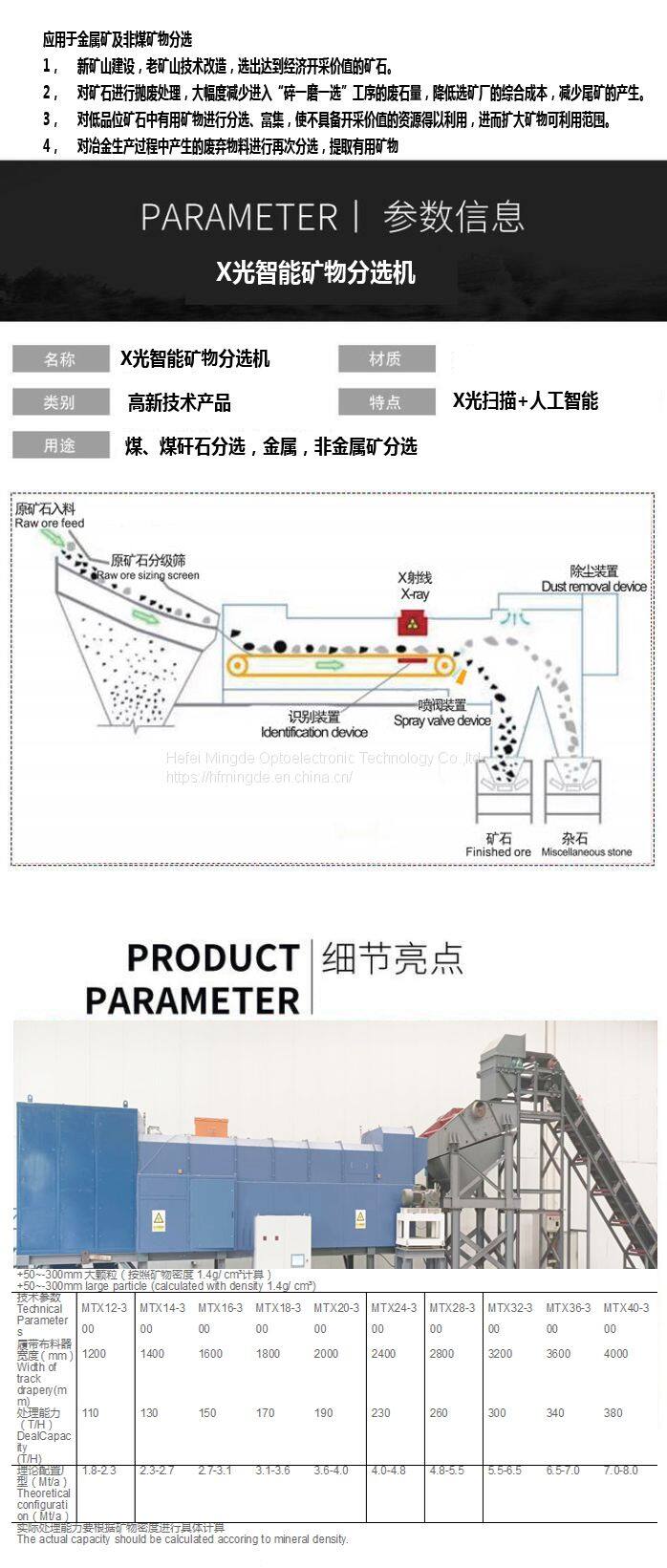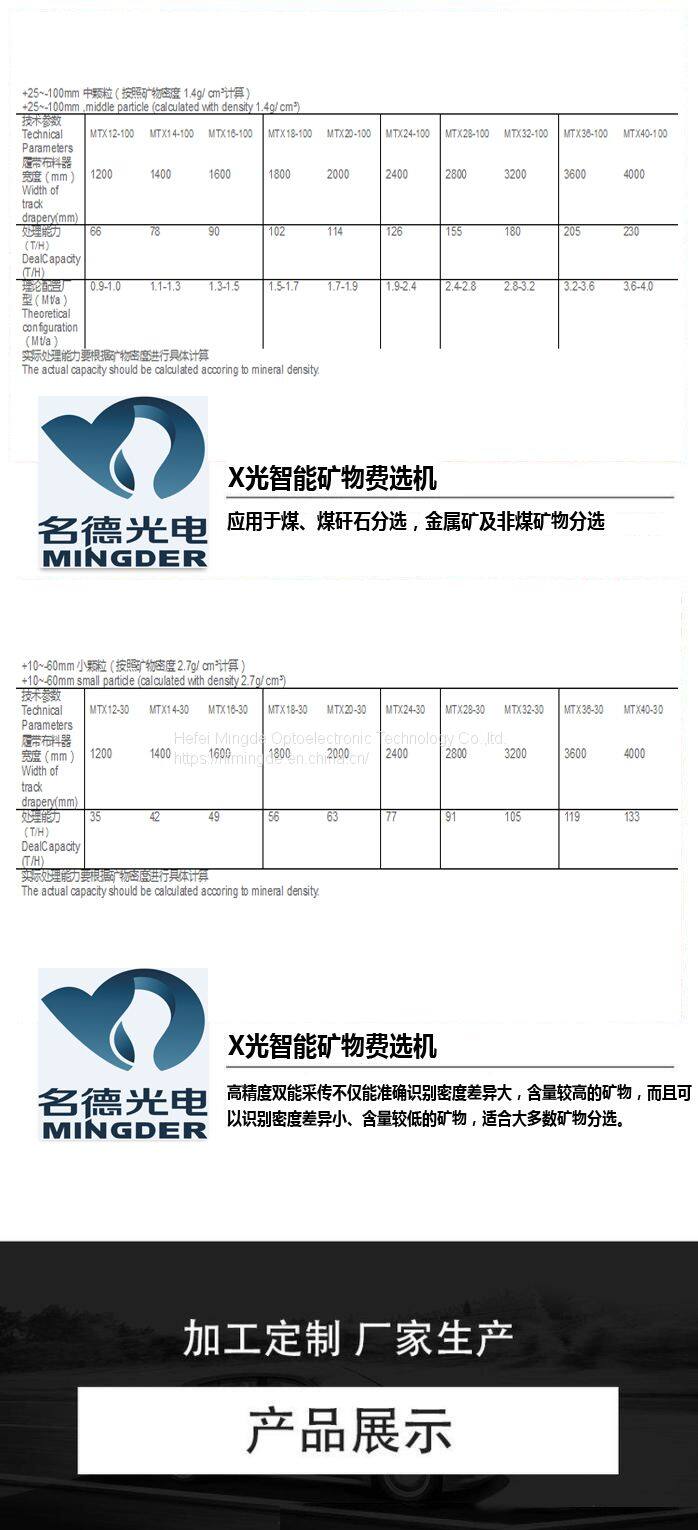 Mingde MTX series X-ray intelligent mineral sorter can handle ore size from 300mm to 10mm. For example , According to the mineral density of 1.4g/cm³, the processing capacity of one unit can reach up to 380t/hour. The specific selection table is as follows