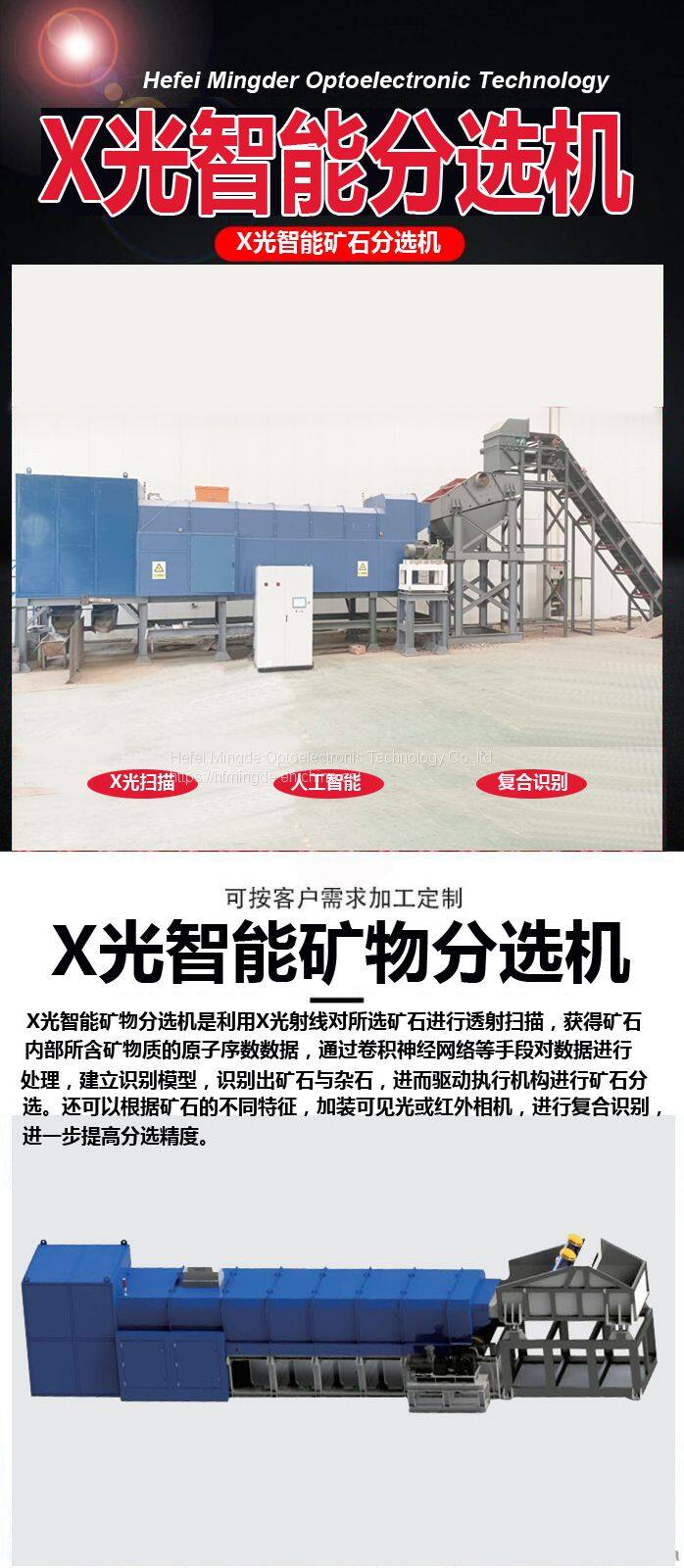 X-ray intelligent mineral sorting machine uses X-ray to transmit scanning of the selected ore, obtains the atomic number data of the minerals, processes the data by means of convolutional neural network and other means, establishes an identification model, identifies the ore and miscellaneous stones, and then drives the actuator to sort the ore. It is also possible to add visible or infrared cameras for composite identification according to the different characteristics of the ore to further improve the sorting accuracy.