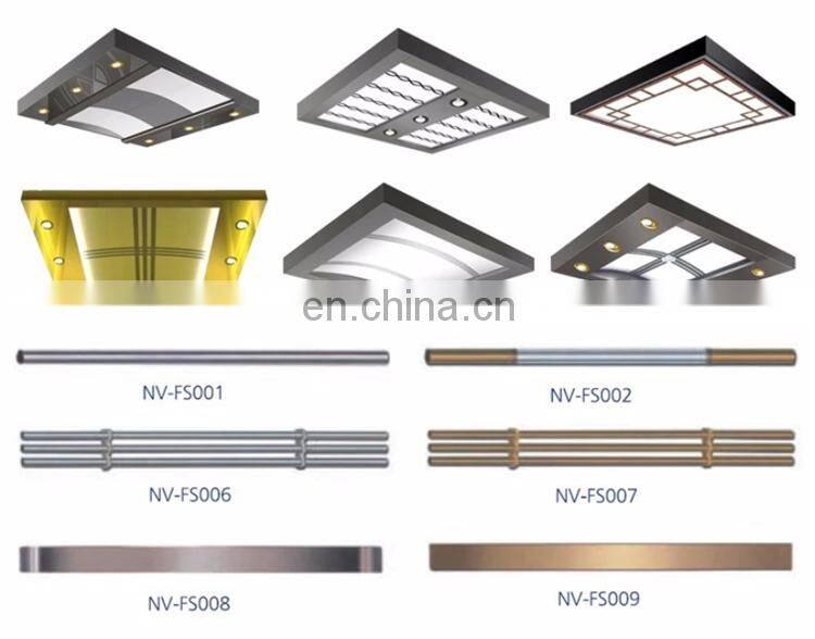 Car Ceiling: Power coated/hairline/mirror/etched stainless steel, titanium steel, wood veneer, acylic, LED lights
