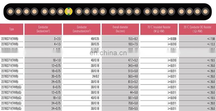 Type | Conductor Section(mm2) | Conductor Construction(mm2) | Overall diameter Dia.(mm) | 70℃ Insulated Resister (M Ω·KM) | 20℃ Conductor DC Resister (Ω/KM) |