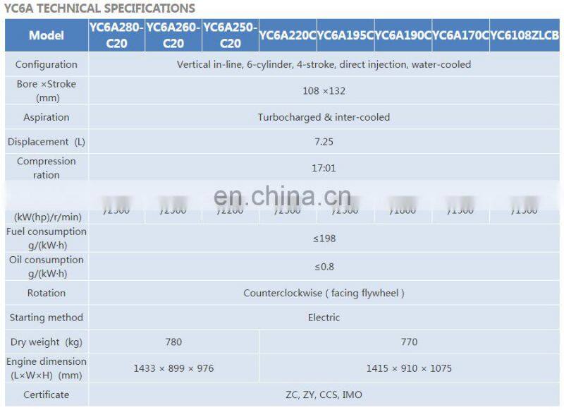 Product name | widely used (152-280hp) Yuchai YC6A series water cooled marine/boat diesel engine YC6A260-C20 | ||||