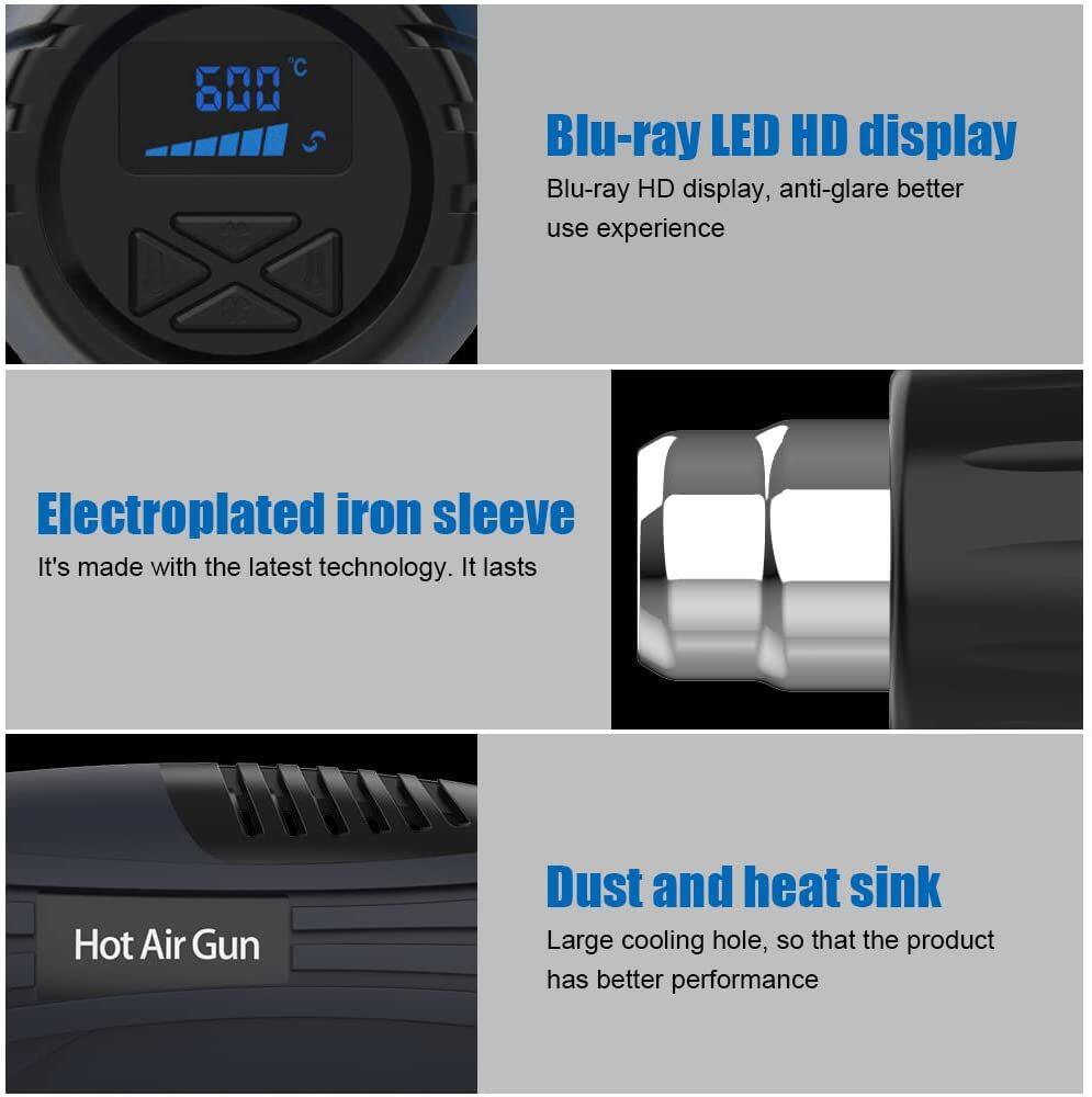 3.Blue-ray display HD display,anti-glare better use experience 4.Memory settings,heat gun remains the temperature settings after switching off