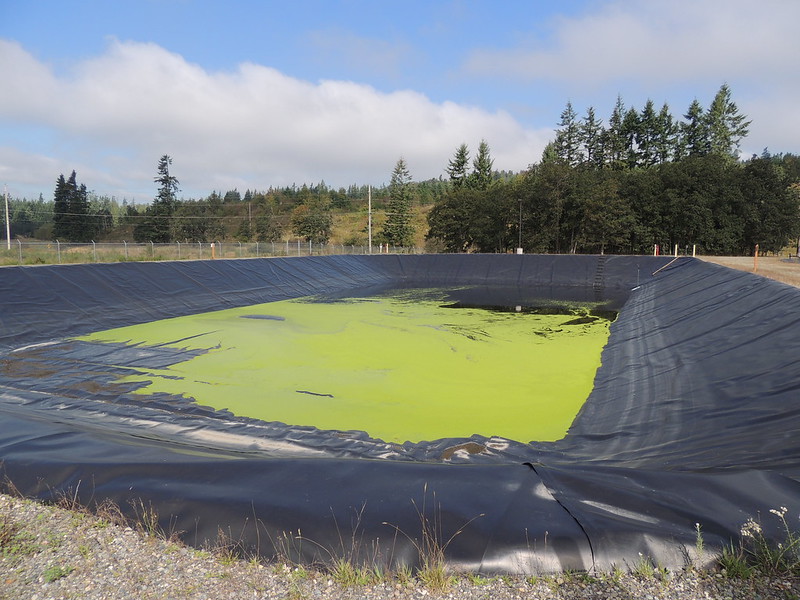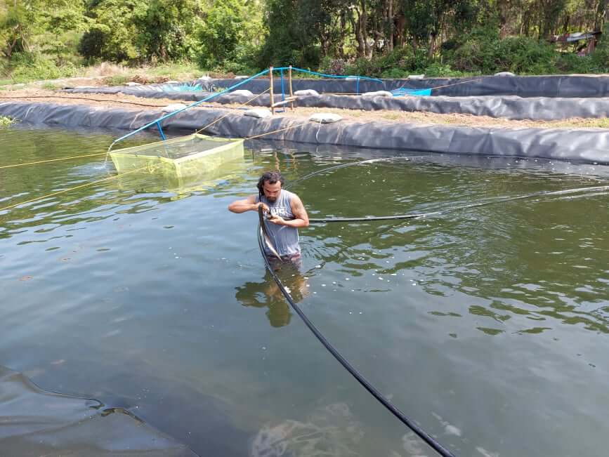 materials like rocks or tree stumps and branches removed across the surface of the pond bottom, and extending up along all the