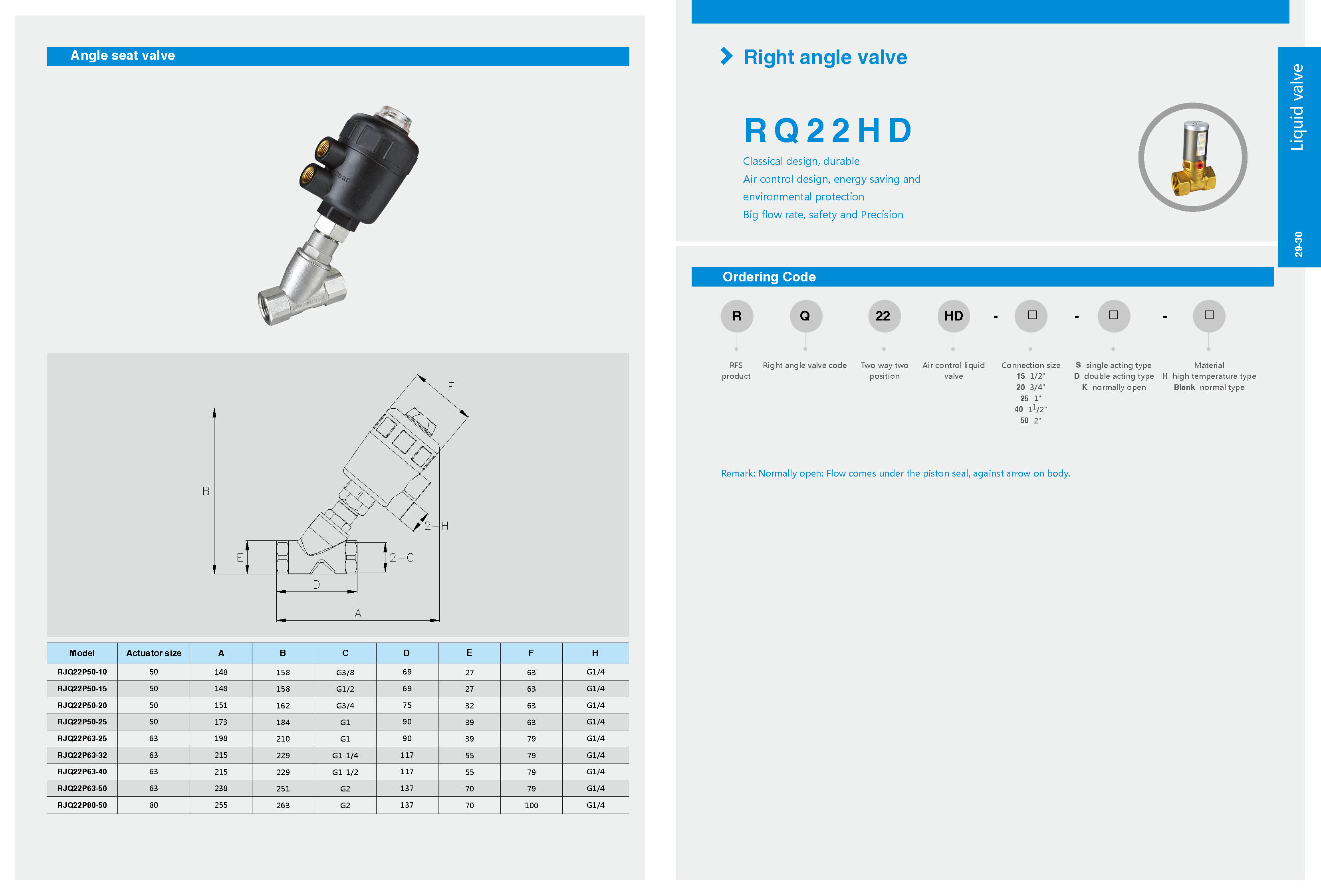 RQ22HD-50D 2/2-way Air Control Hydraulic Right Angle Valve Pneumatic Right Angle Valve