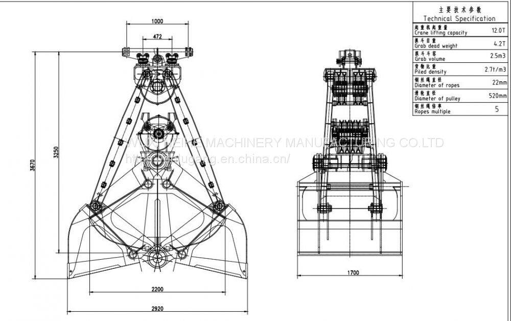 The grab overall structure is light and durable, offering high grabbing ratio, strong closing force and high material filling rate.