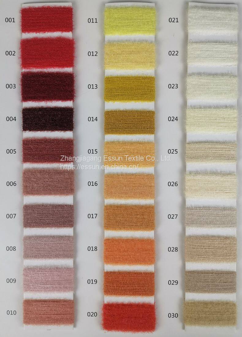 ZHANGJIAGANG ESSUN TEXTILE CO.,LTD is located in zhangjiagang city, Jiangsu Pro. CHINA, We have 40000 spindles chenille yarn machines, 300sets crochet machines, 1500 spindles cylinder knitting machines. we are specialzed in producing, researching and developing various types of yarn, mainly chenille yarn and fancy yarn in different materials, like wool, alpaca, mohair, polyester ,nylon ,acrylic ... Chenille yarn's capacity is more than 300tons per month, Crochet fancy yarns's capacity is over 200tons per month, we have good cooperated dyeing factory, can dye 300ton per month. we beloeve that only producing excellent quality yarns, efficient service and professional management can make us develop steadily.