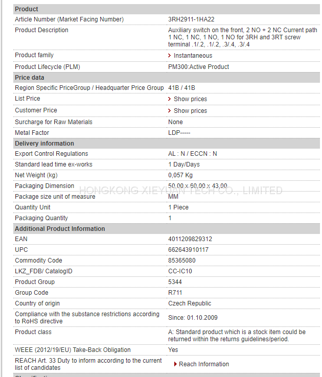 | 3RH2911-1HA22 Auxiliary switch on the front, 2 NO + 2 NC Current path 1 NC |