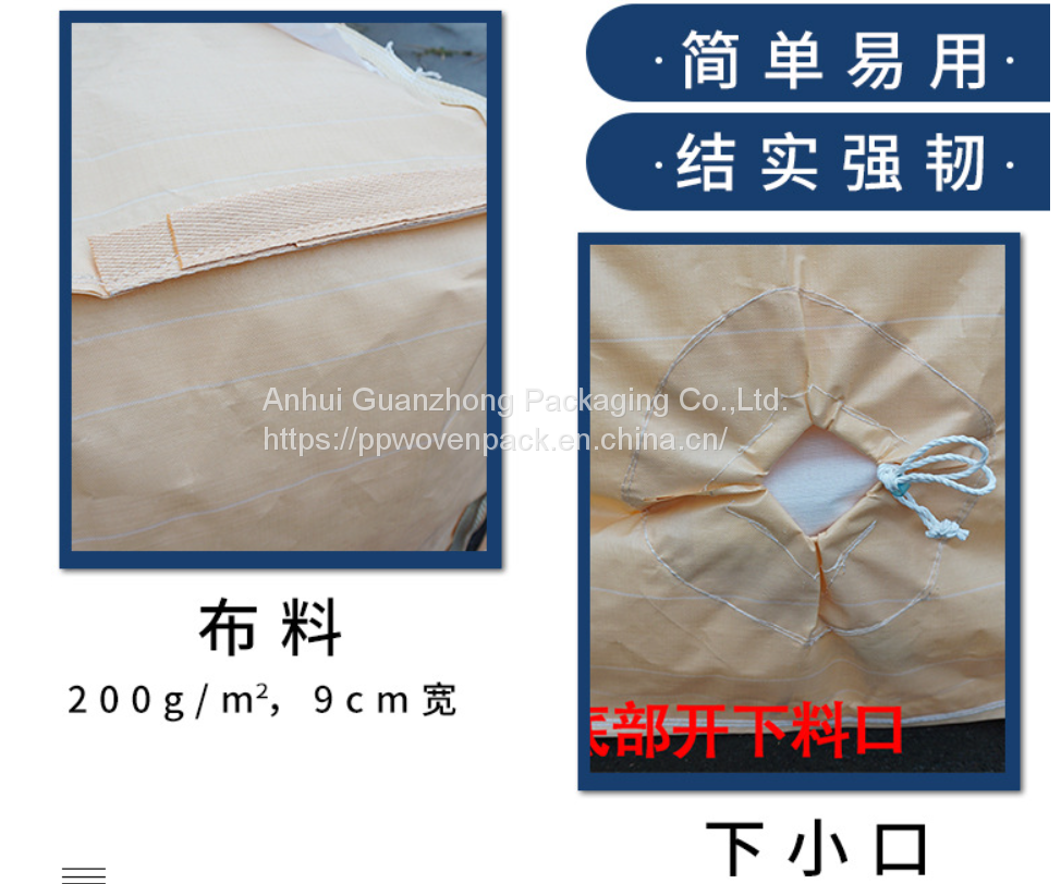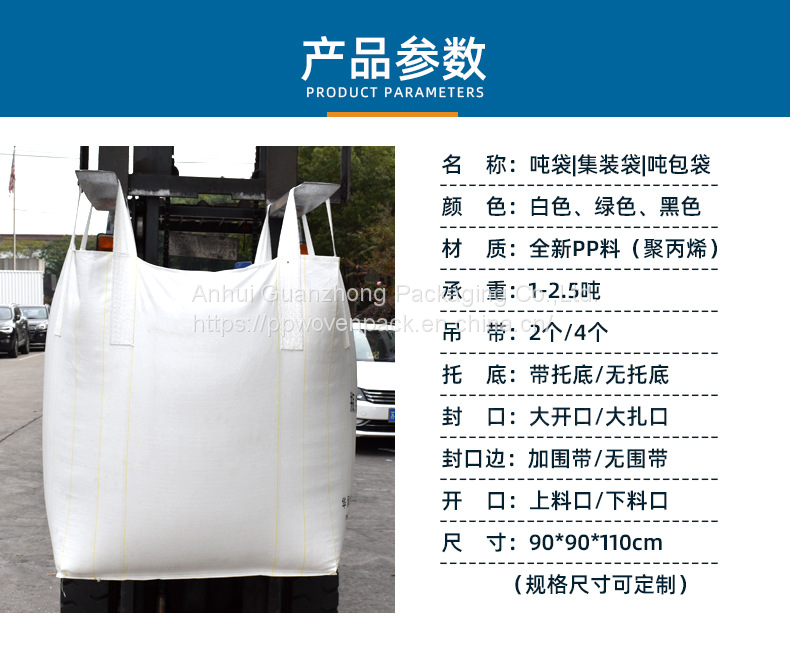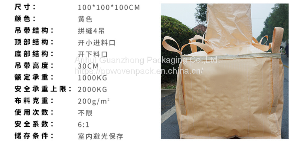 Big bag 1000kgs (Jumbo bag1000kgs or bulk bag 1000kgs) can be widely used in different fields. Such as Chemicals, construction materials, plastic raw materials, Mineral products, Firewood,and other types of powder, granules, block goods packaging.