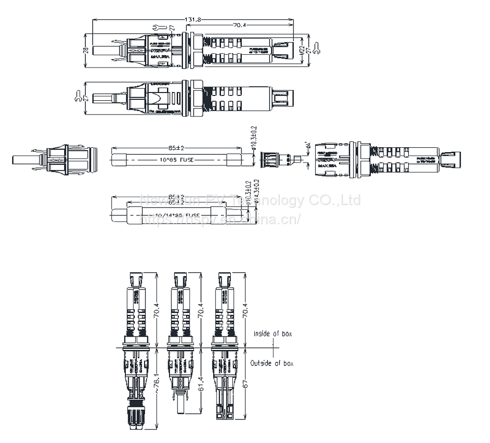 - Main products: PV4.0 connector 1000V DC/PV4.0 connector 1500V DC, Solar DC Fuse connector 1000V/1500V, BIPV Junction Box/Miniature Circuit Breaker, PV Solar Cable/Cable Assemlies/Solar Switch, AC3/AC5 Cores Connector/AC1/3/4/5Cores Connector, DC MCCB/PV Surge Protective Device(SPD), PV Fuse holder and Fuse Link