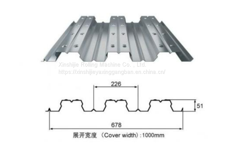 YX51-226-678 open floor bearing plate, also known as YX51-226-678 floor bearing plate, YX51-226-678 profiled steel plate It is an open floor bearing plate model, its rib height is 51mm, composed of three waves, each with a wave pitch of 226mm, the effective coverage width of the entire profiled steel plate is 678mm, the unfolding width is 1000mm, and the utilization rate is 67.8%. This plate type has a long history and is still in use today, characterized by relatively high rib height and good rigidity, so the unsupported span in the construction stage is relatively large, and it is used as a formwork in the later use stage.