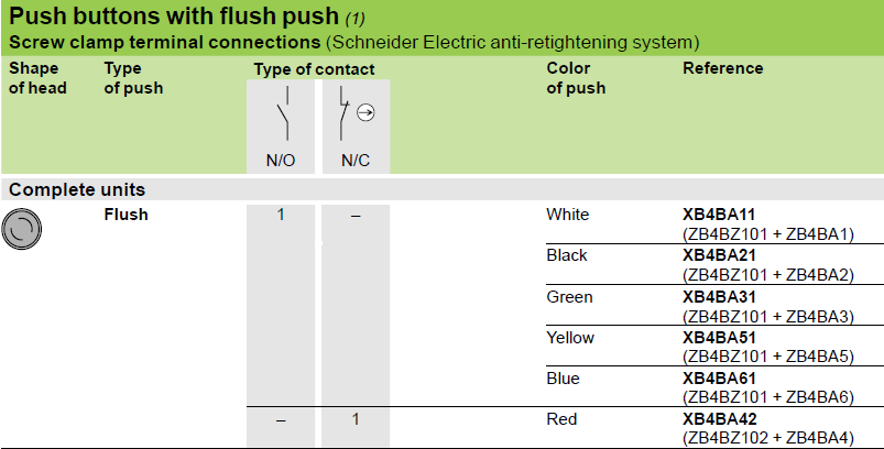 Home > Electrical & Electronics > Power Transmission & Transformer > Transformer > Schnieder Push Button XB4BA11 White XB4BA21 Black XB4BA31 Green XB4BA51 Yellow XB4BA42 Red Spring Return Flush Metal Pushbutton
