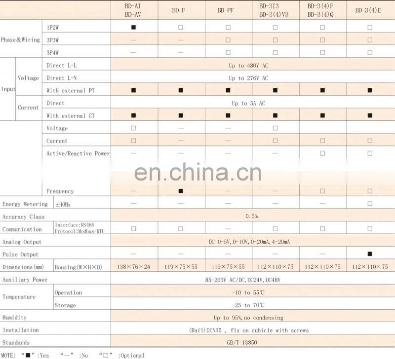 BD-PF | 3-phase Power-Factor | 0~1A AC/0~5A AC and 0~100/220/380V AC | 4~20mA DC/0~20mA DC 0~5V DC/0~10V DC RS485 (MODBUS-RTU) | 3-phase 4-wire |