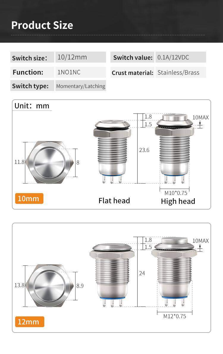10mm Metal High Round Head 1 Normally Open and 1 Normally Close Electrical Button Momentary