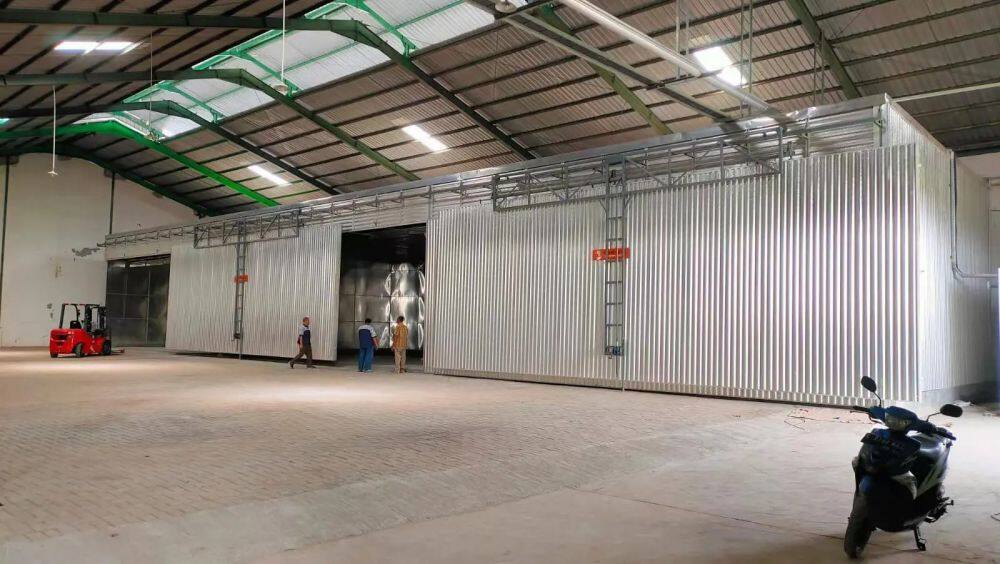 The kiln is built in all aluminum and stainless steel constructon for corrosion resstance and is installed on a concrete foundation. The construction consists of an aluminum inner wall and outer wall with fiber glass insulation in between. The multi-layer kiln structure can effectively balance expansion and shrinking stresses caused by temperature differences between the inside and the outside of the kiln while in operation. This ensures that the kiln stays prperly sealed. In cold area like syberia, we adopt 150mm thicknes profile and 35x35mm corrugated ceiling, which can afford 200KG snow load.