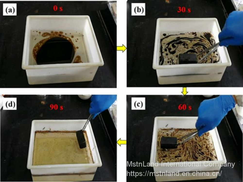 As shown in the figure above, add a simulated sea water containing 3.5% NaCl and pour 10 mL crude oil into the tank. A graphene-based oil sponge is held with tweezers and the oil on the water surface is absorbed back and forth. Under the action of the sponges' lipophilic and capillary forces, the crude oil from the water surface quickly penetrates into the sponges' pores. With the recovery process, the oil storage space of sponge gradually decreases, and the oil absorption rate decreases compared with the beginning. After 90s, most of the oil is recovered, and the sponge can continue to float on the water surface, which is conducive to salvage and recovery.