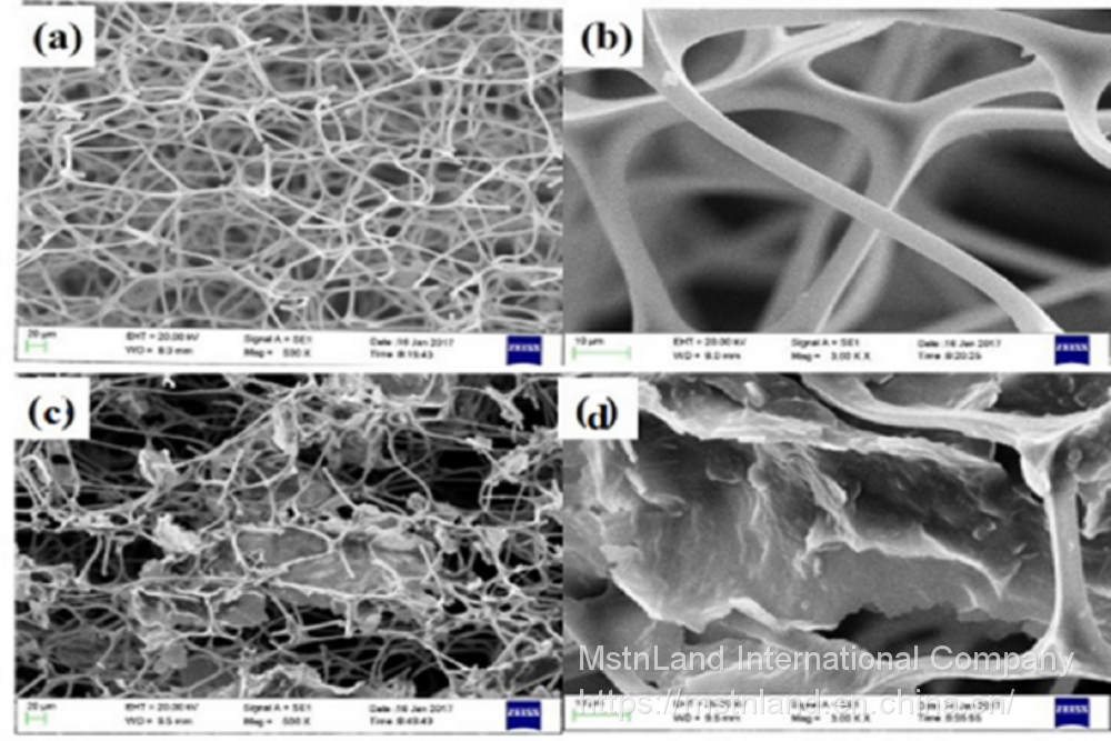 The above is the electron microscope scanning of the corresponding microstructure of blank sponge and graphene-supported sponge magnified 500 times (left) and 3000 times (right) respectively. Figure a and b show that the skeleton of blank melamine sponge is smooth and interwoven, forming multistage micropore structure with pore size ranging from tens to hundreds of microns. Therefore, oil or organic solvents can freely pass through the internal pores; The cross-linked skeleton structure of the sponge can also effectively support the weight of the adsorbed oil, giving the sponge a larger oil absorption capacity. According to the surface wetting theory, the material surface wettability is related to surface roughness and chemical properties. Because the blank sponge skeleton surface is smooth and flat, and contains a large number of hydrophilic groups, the oil-water separation selectivity is poor. As can be seen in Figure c and d, a large number of clumped and irregularly distributed graphene coatings appeared on the surface of the skeleton structure of the graphene loaded sponge. After local amplification, it could be clearly seen that there were crumpled protrusions with micro or nano size attached to the pore wall, which greatly increased the roughness of the sponge.