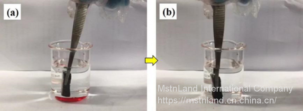 The water bottom of the beaker is trichloromethane stained with Sudan Red III. Dip the graphene-based oil sponge into the water bottom, and the trichloromethane is immediately adsorbed without absorbing water. It can be seen that in addition to oil recovery on the water surface, graphene-based oil absorbing sponge also has good selective adsorption for underwater oil or organic solvent leakage, and can be applied in the field of underwater oil and water separation. Sponges are good at oil philicity and hydrophobicity, and have strong selective absorption for heterogeneous oil-water mixing systems. They have great advantages in waters where large mechanical recovery equipment is difficult to operate, such as shoals and riverbanks.