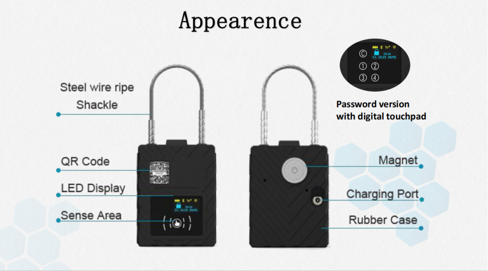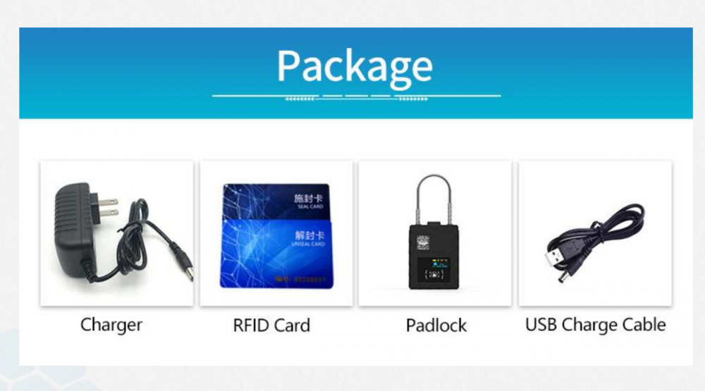 • (Lock, Charger, Seal Card, Unseal Card, User Manual)