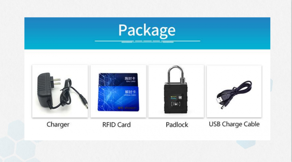 • (Lock, Charger, Seal Card, Unseal Card, User Manual)