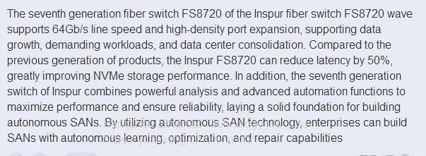 The seventh generation fiber switch FS8720 of the Inspur fiber switch FS8720 wave supports 64Gb/s line speed and high-density port expansion, supporting data growth, demanding workloads, and data center consolidation. Compared to the previous generation of products, the Inspur FS8720 can reduce latency by 50%, greatly improving NVMe storage performance. In addition, the seventh generation switch of Inspur combines powerful analysis and advanced automation functions to maximize performance and ensure reliability, laying a solid foundation for building autonomous SANs. By utilizing autonomous SAN technology, enterprises can build SANs with autonomous learning, optimization, and repair capabilities