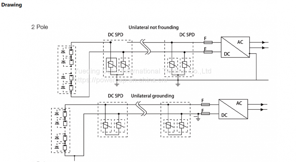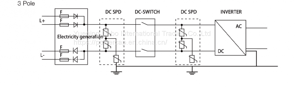 Surge protective device, protect against lightning surge voltages in solar system (photovoltaic power supply system). These units must be installed in parallel on the dc networks to be protected and provide common and different modes protection. Its installed location are recommended at both ends of the dc power supply line (solar panel side and inverter/converter side), especially if the line routing is external and long. High energy MOVs equipped with specific thermal disconnectors and related failure indicators.