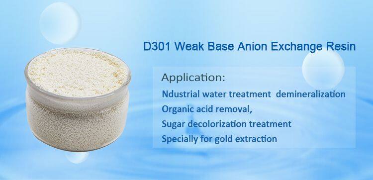 D301 anion exchange resin is a macroporous weakly basic styrene-based anion exchange resin. Its structure is very strong, and it's repeated transformation expansion rate is very low. D301 series exchange resin has good adsorption performance, organic matter is easily released during regeneration, so it has good anti-pollution performance.