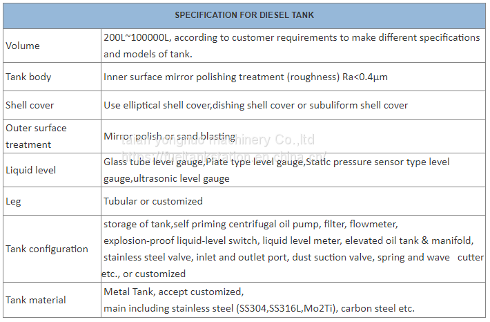 diesel fuel oil storage tank is the specialized tank for diesel and generator, which mainly consists of storage of tank,self priming centrifugal oil pump, filter, flowmeter, explosion-proof liquid-level switch, liquid level meter, elevated oil tank & manifold, stainless steel valve. The elevated oil tank can be put in the skid before transportation and the pipelines of elevated tank & storage tank do not need to be dismantled.The top platform is made of diamond plate and there are drain holes on the bottom.The oil tank also has dust suction valve, spring and wave cutter inside