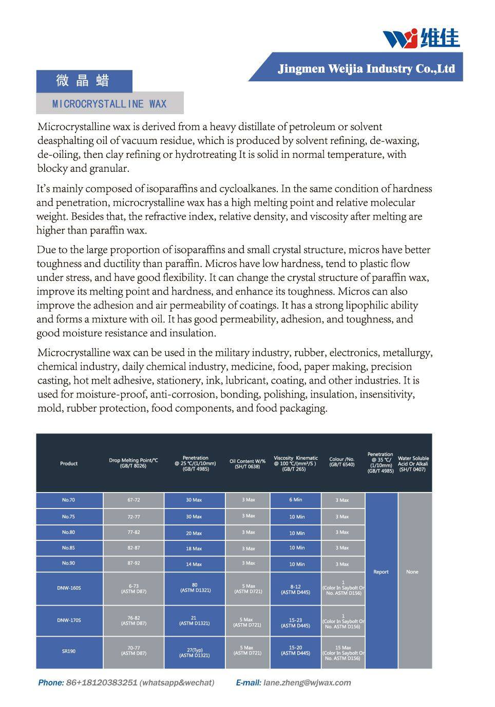 Our advantage is the production of special waxes, such as food-grade microcrystalline wax, rubber protective wax, automobile chassis anti-rust wax, poultry hair wax, explosive compound wax, etc.