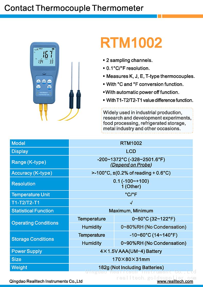 It is a hand-held of dual-channel digital thermocouple thermometer, which uses thermocouples as sensors to measure temperature signals, can meet the needs of different industries. Used to measure the temperature of liquids, gases, solids and surface temperature. And there are a variety of thermocouple types to choose from, which are widely used in industrial production, research and development experiments, food processing, refrigerated storage, metal industry and other occasions.
