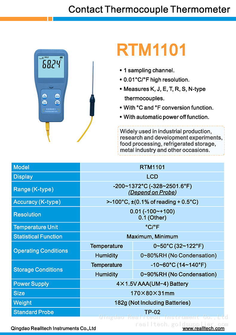 It is a high-precision of intelligent thermocouple thermometer, which uses thermocouples as sensors to measure temperature signals, can meet the needs of different industries. Used to measure the temperature of liquids, gases, solids and surface temperature. And there are a variety of thermocouple types to choose from, which are widely used in industrial production, research and development experiments, food processing, refrigerated storage, metal industry and other occasions.