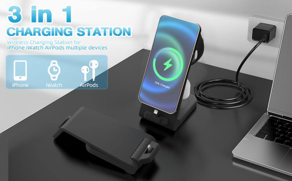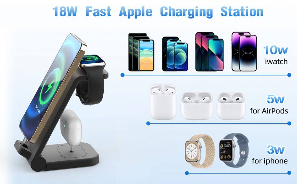 1. 18W Fast charging Station: The iphone and airPods charging must be inserted into the charging port, the only thing that's wireless is the Apple Watch Charging Port. Apple Charging Station only takes 2 to 3 hours to fully charge your smart device, much faster than these wireless chargers.