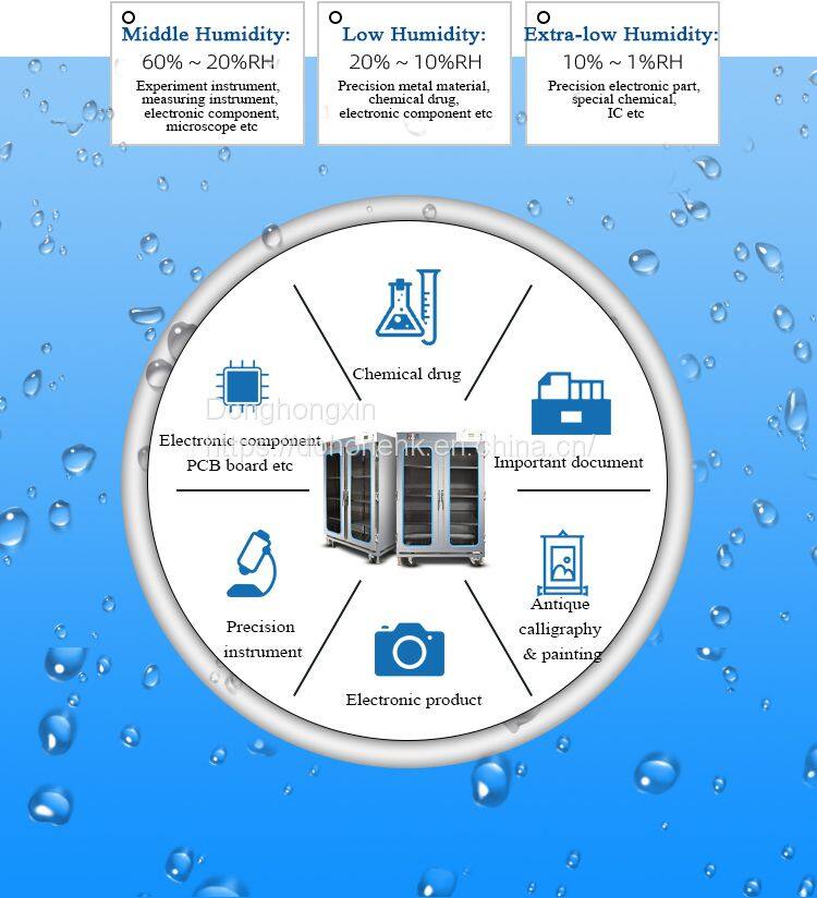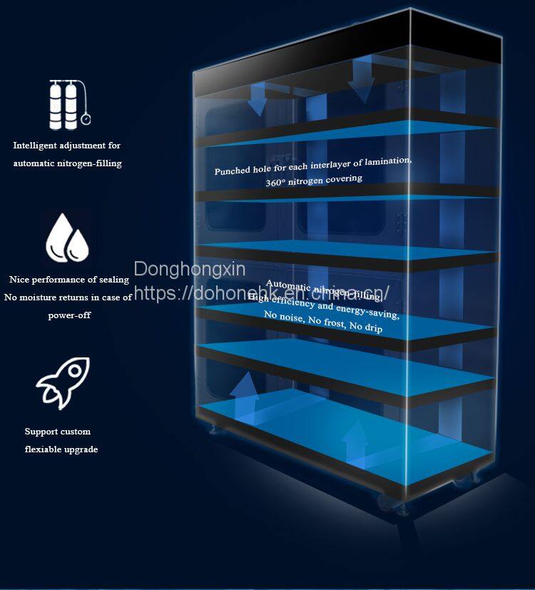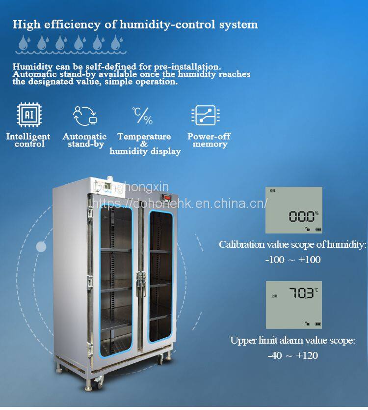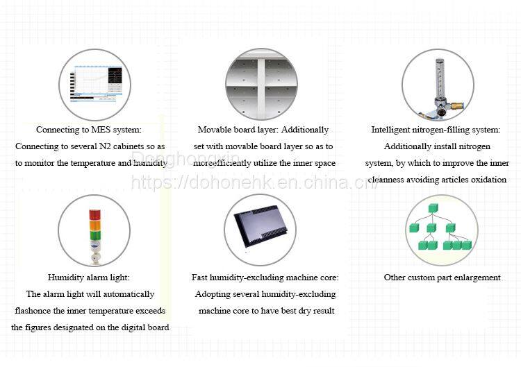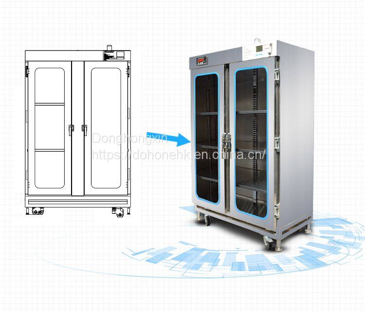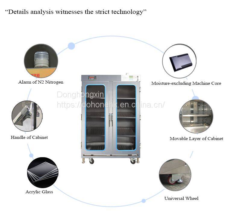 Dohone intelligent nitrogen gas cabinet is a kind of drying cabinet developed by DoHOone in order to avoid the phenomenon of micro cracks and steam burst air welding after excessive high temperature caused by moisture in the manufacturing of IC semiconductor, PCB and SMT. Compared with the traditional nitrogen tank, DoHone intelligent nitrogen tank adopts the fully automatic mode and uses the humidity setting environment of 1%~, which can accurately detect the humidity change in the nitrogen tank and automatically control the nitrogen filling, thus effectively saving energy and achieving a good oxidation prevention effect, saving 27% nitrogen consumption. When products are stored, we have a safety alert function to better protect the items. Combined with users' application requirements for remote control of intelligent Internet of Things, we developed mobile APP and PC web intelligent Internet of Things platform, which can feed back the status in real time through the cloud control APP and save manpower. Also equipped with high load adjustable laminate, can be more flexible choice of storage object size. In order to meet the special needs of some manufacturers, DoHone intelligent nitrogen tank also supports datuk customization and flexible upgrading.